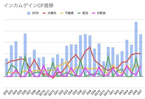 資産から生まれる現金(CF)を集計するインカムゲインCFのコーナーです。現在実行中のバケツ戦略では、生活費を賄う「短期バケツ」に、他のバケツからのインカムゲインCF=配当や分配金が流れ込みます。生活費に比べてインカムCFが少なければ、バケツの中身…