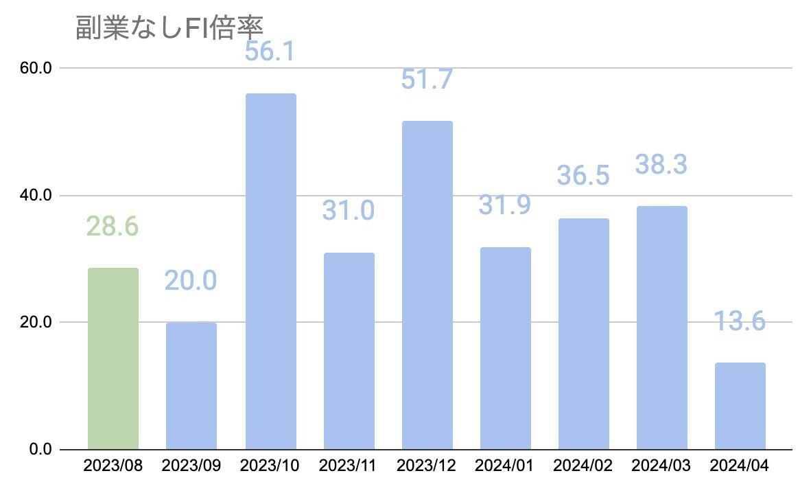 ただこれは副業を同レベルで継続する前提です。副業なしだと、資産は13.6年しかもちません。さすがにこれじゃやってられませんね。
